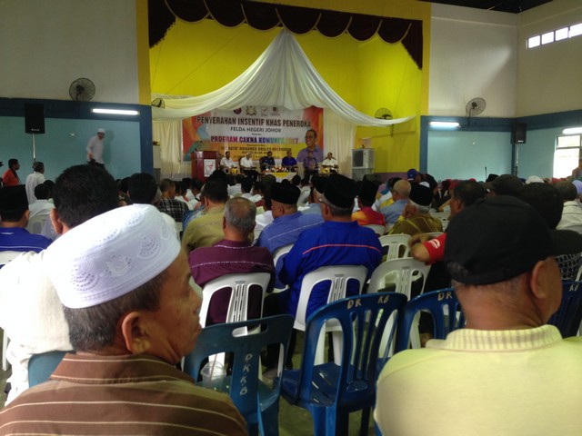 Di dalam dewan raya Felda Taib Andak terdapat taklimat yang disampaikan oleh Pengerusi FELDA, Yb Tan Sri Shahrir Bin Abdul Samad dan Menteri Besar Johor, Datuk Seri Haji Mohamed Khaled Nordin mengenai penyerahan insentif kepada peneroka FELDA. Selesai taklimat tersebut, wakil Pengerusi Felda dan Menteri Besar Johor melawat golongan warga tua yang paling lama menetap di Felda Taib Andak untuk diberi sumbangan wang ringgit dan keperluan dapur. Staff PI, Pencetus Ummah (PU) Muhsin dan artis Aiman Tino turut membantu dalam pengagihan sumbangan ini.