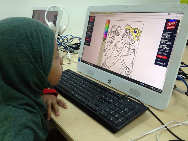 Kelas ini dianjurkan untuk memberi peluang kepada peserta untuk menggunakan kreativiti di dalam diri masing-masing untuk mewarna watak animasi kegemaran mereka. www.4coloring.com telah digunakan sebagai bahan material didalam kelas mewarna ini. Proses mewarna yang mudah dan menghiburkan boleh mengukuhkan lagi kreativiti didalam diri peserta. Ia bertujuan untuk memberi pengetahuan kepada semua peserta bahawa kegunaan internet dapat juga digunakan untuk perkara yang lain melalui kelas ini.
