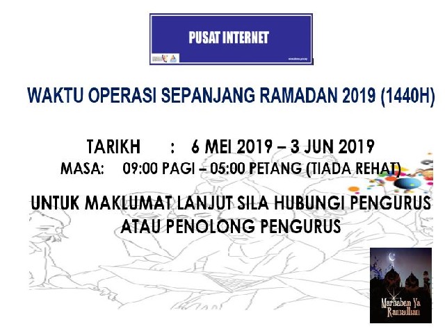 6 May 2019 | Aktiviti TerkiniBerikut adalah Notis Waktu Operasi Pusat Ekonomi Digital Felda Taib Andak pada bulan Ramadhan bermula 6 Mei - 3 Jun 2019
