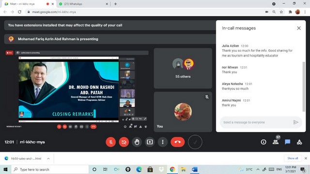 4 Julai 2021 | Aktiviti TerkiniPada 3 Julai 2021, Pusat Ekonomi Digital Komuniti Felda Taib Andak telah mengikuti satu webinar anjuran Universiti Teknologi Mara (UITM) yang bertajuk ‘Pandemic Covid-19 and Beyond Strategic Management For Hospitality Business Survival’. Program ini telah disampaikan oleh Pengurus Besar Hotel UITM Shah Alam, Dato Mohd Onn Rashdi Abd Patah dan dibantu oleh Encik Fikri Hanif bin Muhamad sebagai Moderator. Para peserta yang terlibat telah didedahkan dengan cabaran dunia perniagaan ketika pandemic Covid-19 bagi seorang peniaga. Program ini telah berlangsung selama 1 jam 30 minit bermula pada jam 10.30 pagi sehingga 12.00 tengahari.