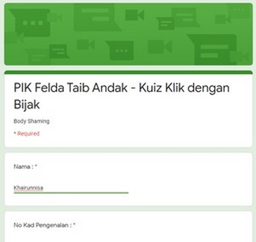 18 Januari 2021 | Aktiviti TerkiniPada 17 Januari 2021 , Pihak pengurusan Pusat Ekonomi Digital Felda Taib Andak telah mengadakan Program Klik Dengan Bijak yang bertajuk Body Shamming. Berikutan Perintah Kawalan Pergerakan (PKP) yang telah dikeluarkan dikeluarkan oleh pihak Majlis Keselamatan Negara (MKN), kami telah mencari satu inisiatif untuk membuat program Klik dengan Bijak melalui atas talian (online). Untuk tajuk kali ini kami telah memilih untuk membuat kuiz berdasarkan tajuk body shamming.